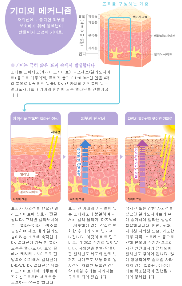 - 기미는 과한 멜라닌 생성으로 생긴다